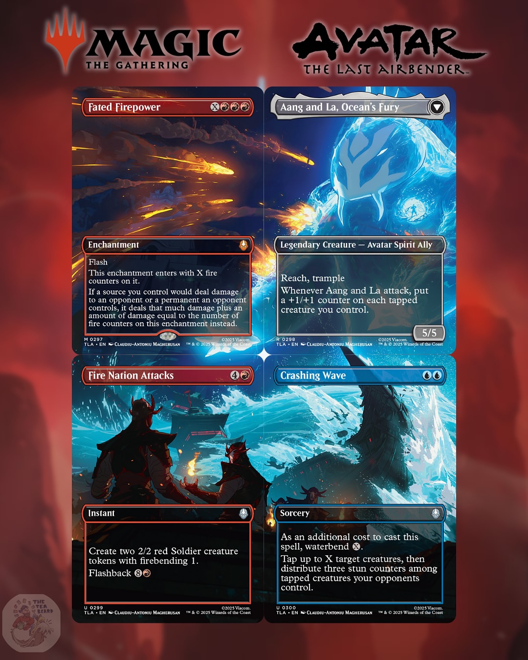 Les quatre cartes Fated Firepower, Aang and La, Ocean's Fury, Fire Nation Attacks et Crashing Wave, de l'édition Avatar: The Last Airbender et illustrées par Claudiu-Antoniu Magherusan, forment une seule image.